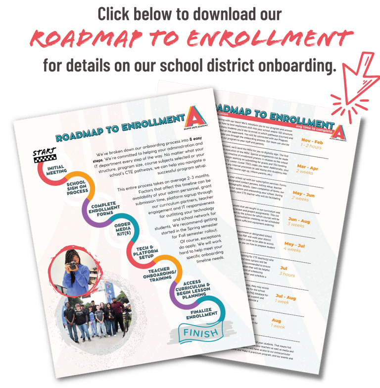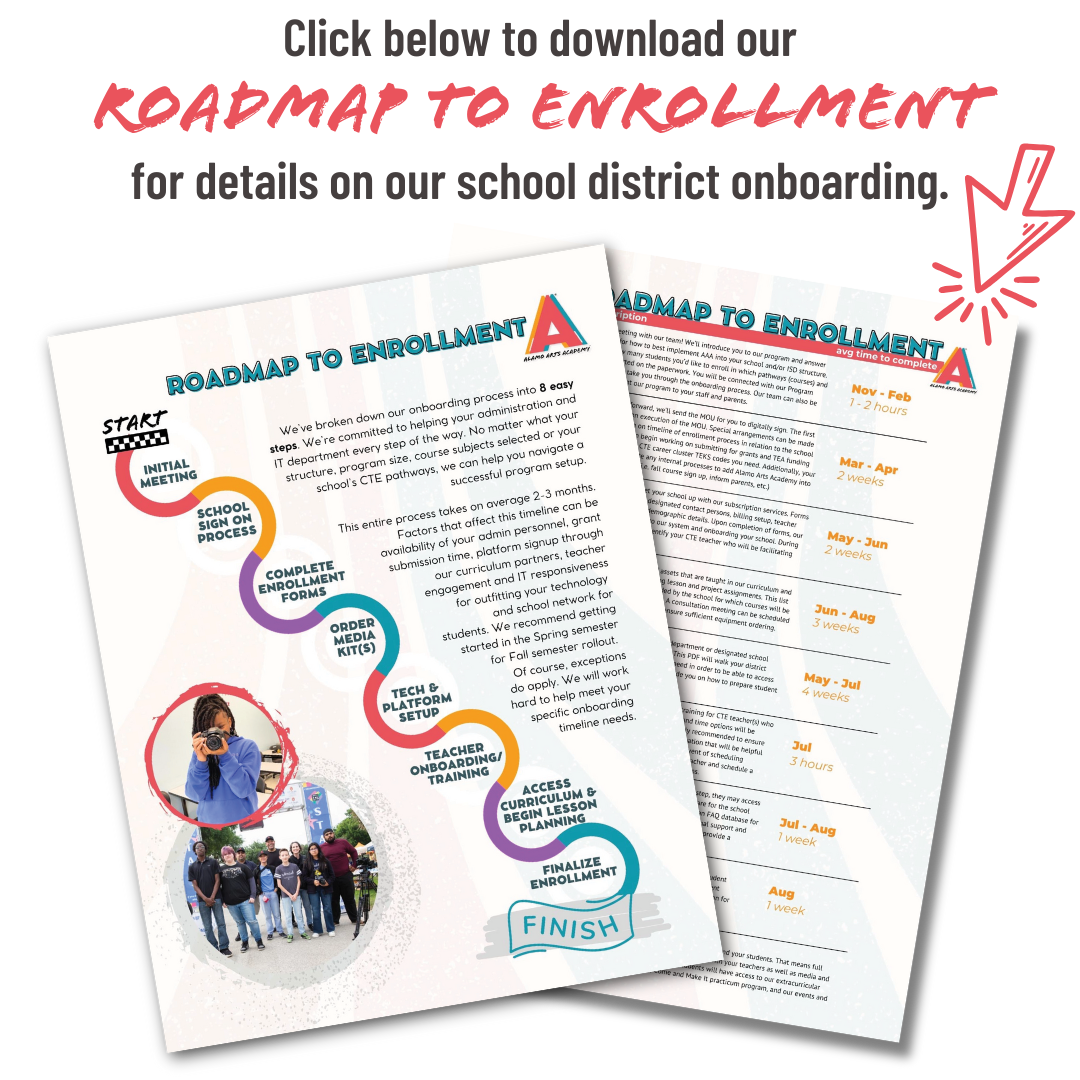 Check out everything our program has to offer. We'd love to meet with your CTE team and administrators to show you just how easy it is to implement Alamo Arts Academy into your school.