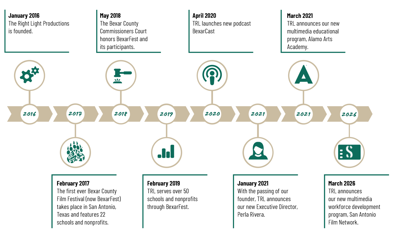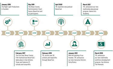 The following two years were ones of progressive organization building and strategic planning. In 2022, TRL launched its brand new multimedia education program, Alamo Arts Academy. What began as an organization looking for a way to create marketing assets for nonprofits, has now transformed into a multimedia educational leader for our communities' youth. As a result, TRL has cast an even wider vision to not only produce BexarFest to showcase young creatives' abilities and nonprofits' missions, but also oversee Alamo Arts Academy to develop these skills.
