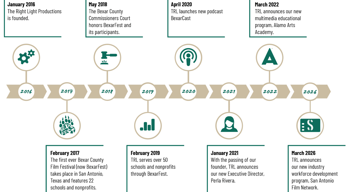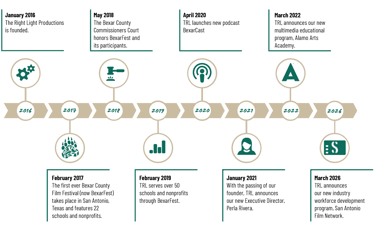 The following five years were ones of progressive organization building and strategic planning. In 2022, TRL launched its brand new multimedia education program, Alamo Arts Academy. In 2026, TRL is expanding their mission and bringing the city a brand new concept, San Antonio Film Network. SAFN is dedicated to educating and training San Antonio for the influx in film productions coming to the city as part of the State of Texas and the City of San Antonio's film incentives increase.